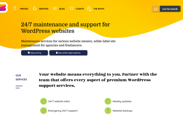 Provides 24/7 WordPress site management with weekly updates, security monitoring, plugin optimization, monthly reporting, and white-label services for agencies.