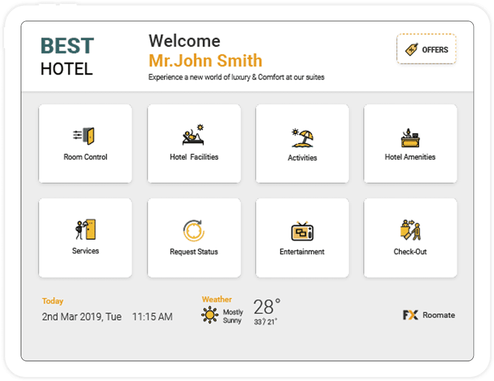 An innovative in-room hotel tablet solution for guests. Provide your guests with a cutting-edge tool designed specially to enhance guest experience. FX Roommate is a highly customisable solution and can be integrated with third parties to provide a comprehensive and memorable experience to your guests.